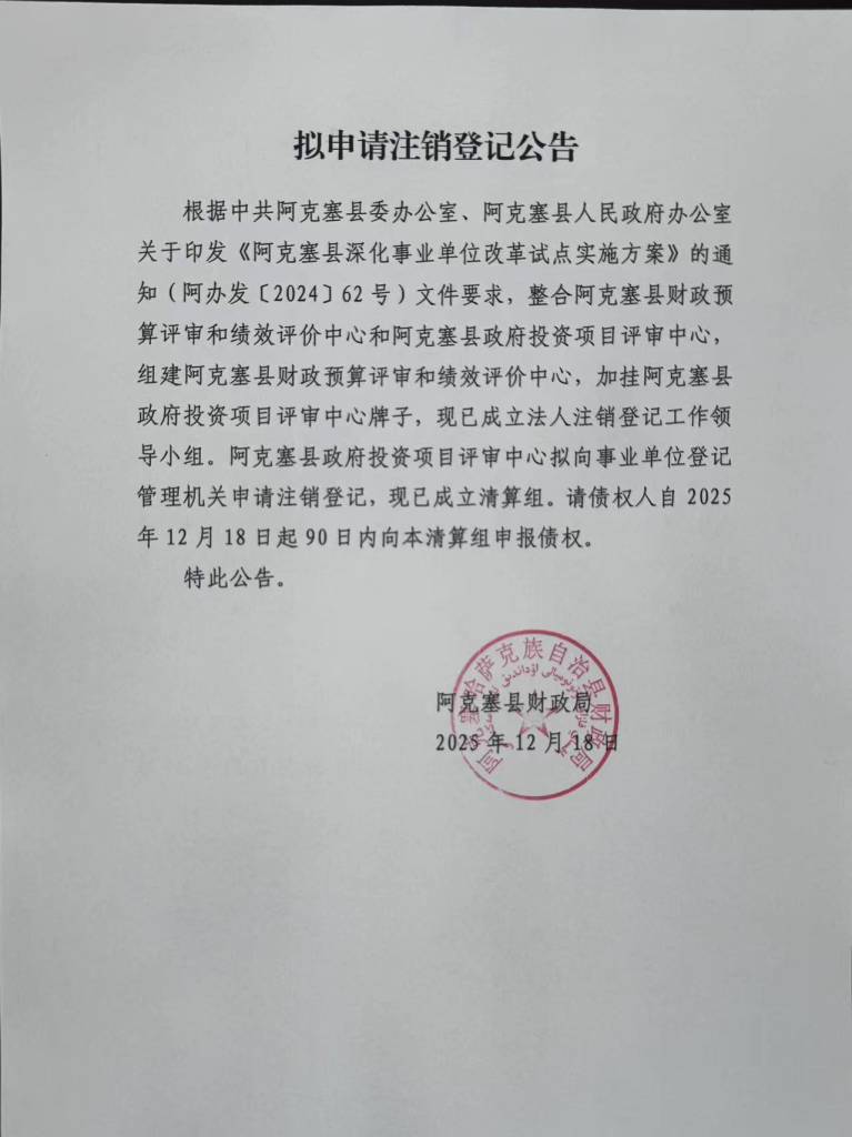 阿克塞哈萨克族自治县政府投资项目评审中心 拟申请注销登记公告