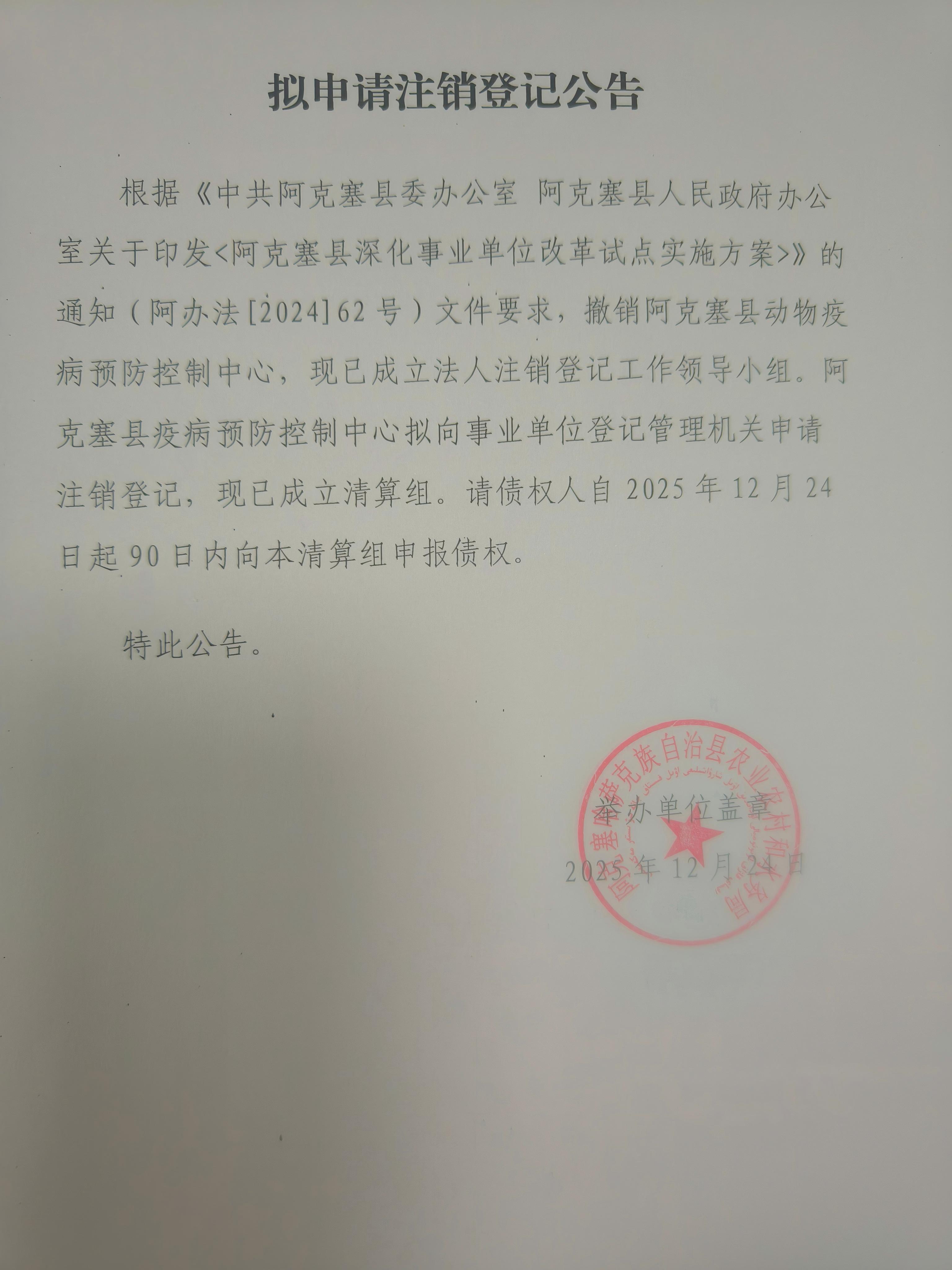 阿克塞哈萨克族自治县动物疫病预防控制中心 拟申请注销登记公告
