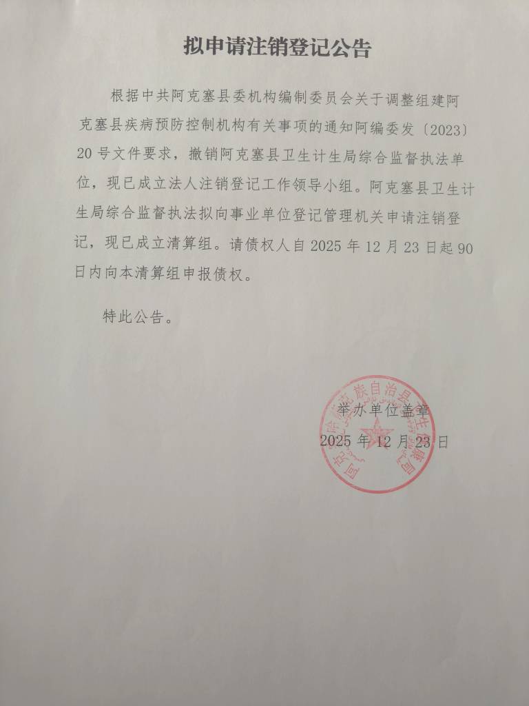阿克塞哈萨克族自治县卫生计生局综合监督执法所 拟申请注销登记公告
