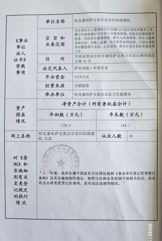阿克塞县2025年度事业单位法人年报公示--阿克塞哈萨克族自治县妇幼保健院