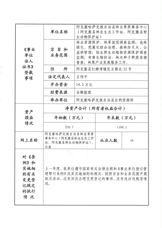阿克塞县2025年度事业单位法人年报公示--阿克塞哈萨克族自治县林业草原事务中心(阿克塞县林业生态工作站、阿克塞县野生动物保护站)