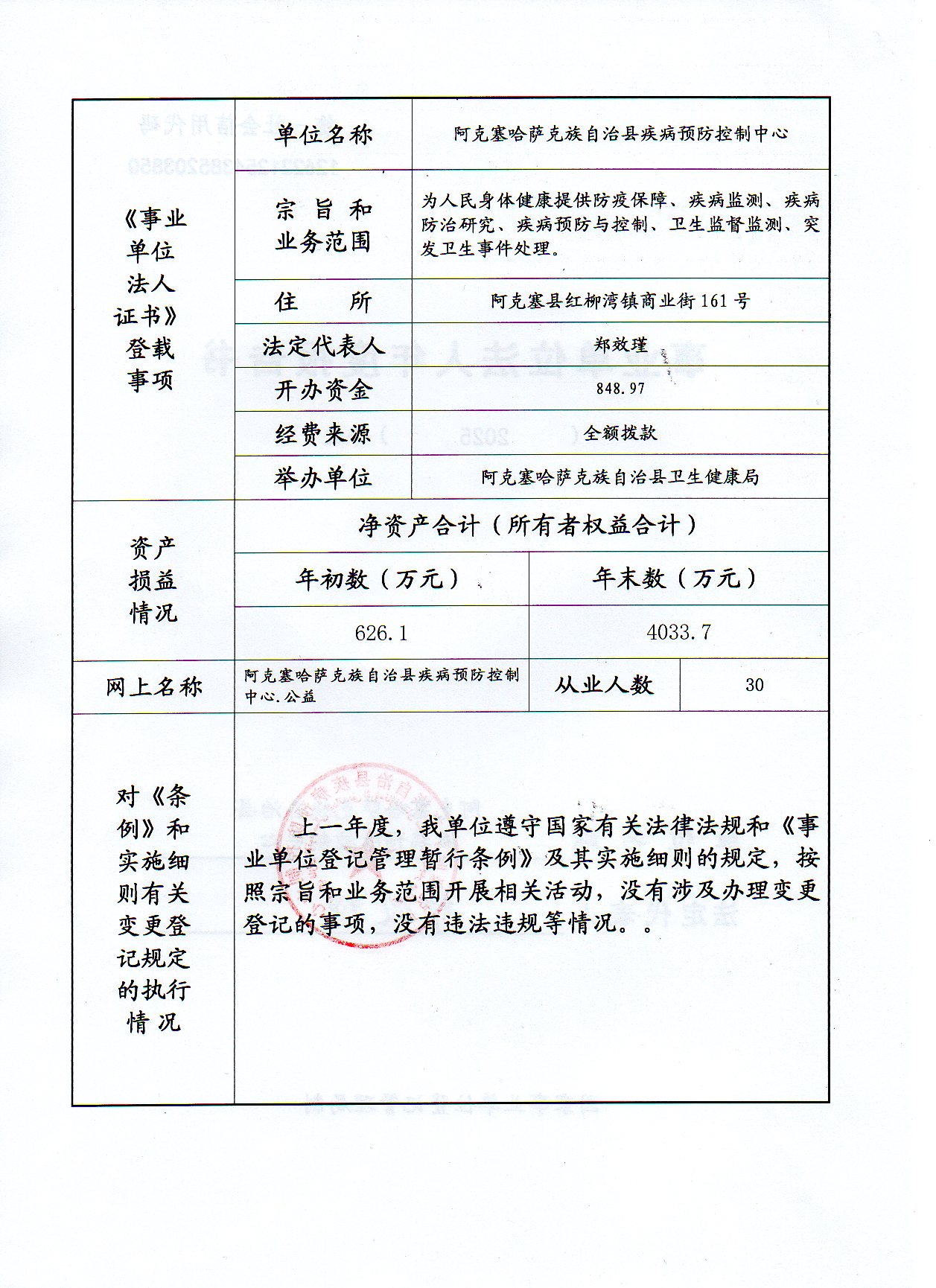 阿克塞县2025年度事业单位法人年报公示--阿克塞哈萨克族自治县疾病预防控制中心